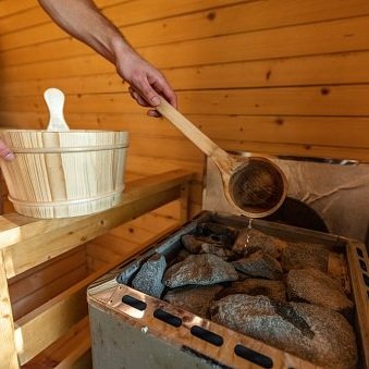 - Evenly sprinkle water on the sauna stones to add humidity.